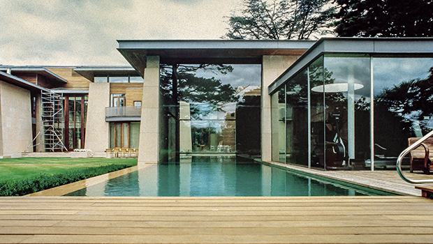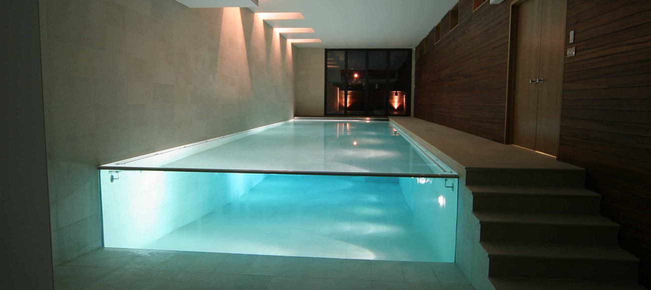 Feature glass end overflow pool with variable water flow speeds. Finished in limestone porcelain tiles with concealed fittings and high specification air handling grills, allowing blended finishes into the extended pool relaxation area.