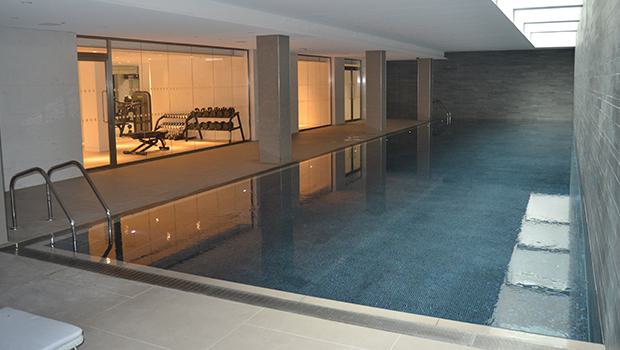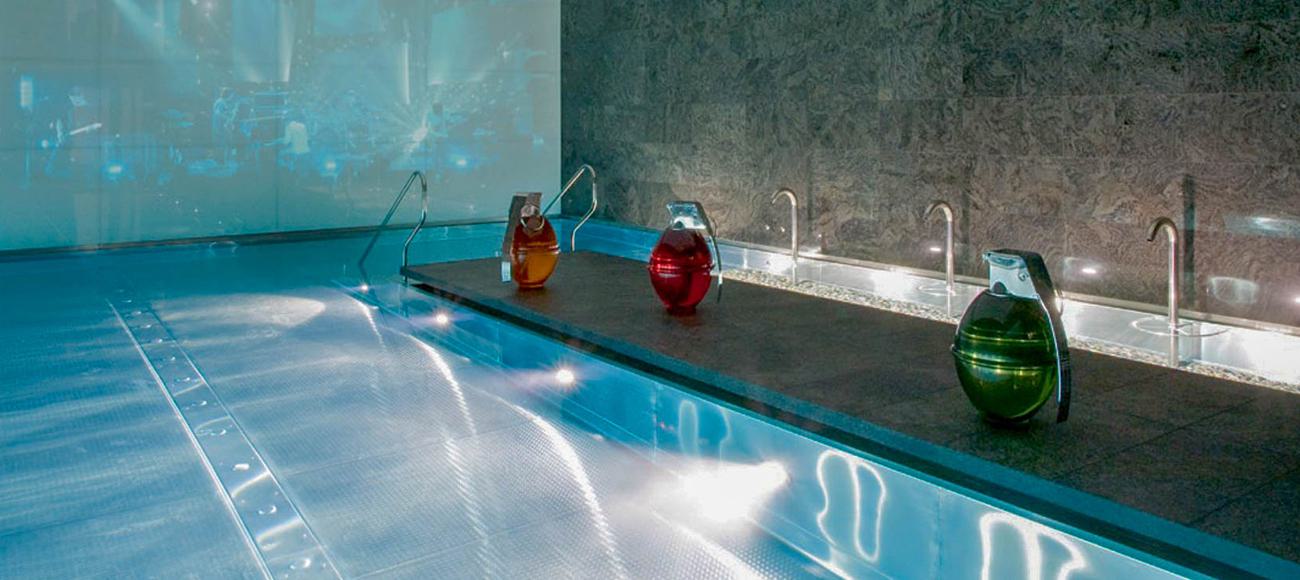 This prestigious swimming pool consisted of a stainless steel pool with peninsular divide creating exercise and relaxation zones, a pebble floor leading up to the massage bench and neck massage stations offers a unique approach to a domestic swimming pool installation. A high-level domestic water treatment system including a primary Full ozone water treatment inclusion with a bespoke and unique Neuman Aqua "über surface draw off". Crystalline glass walls.